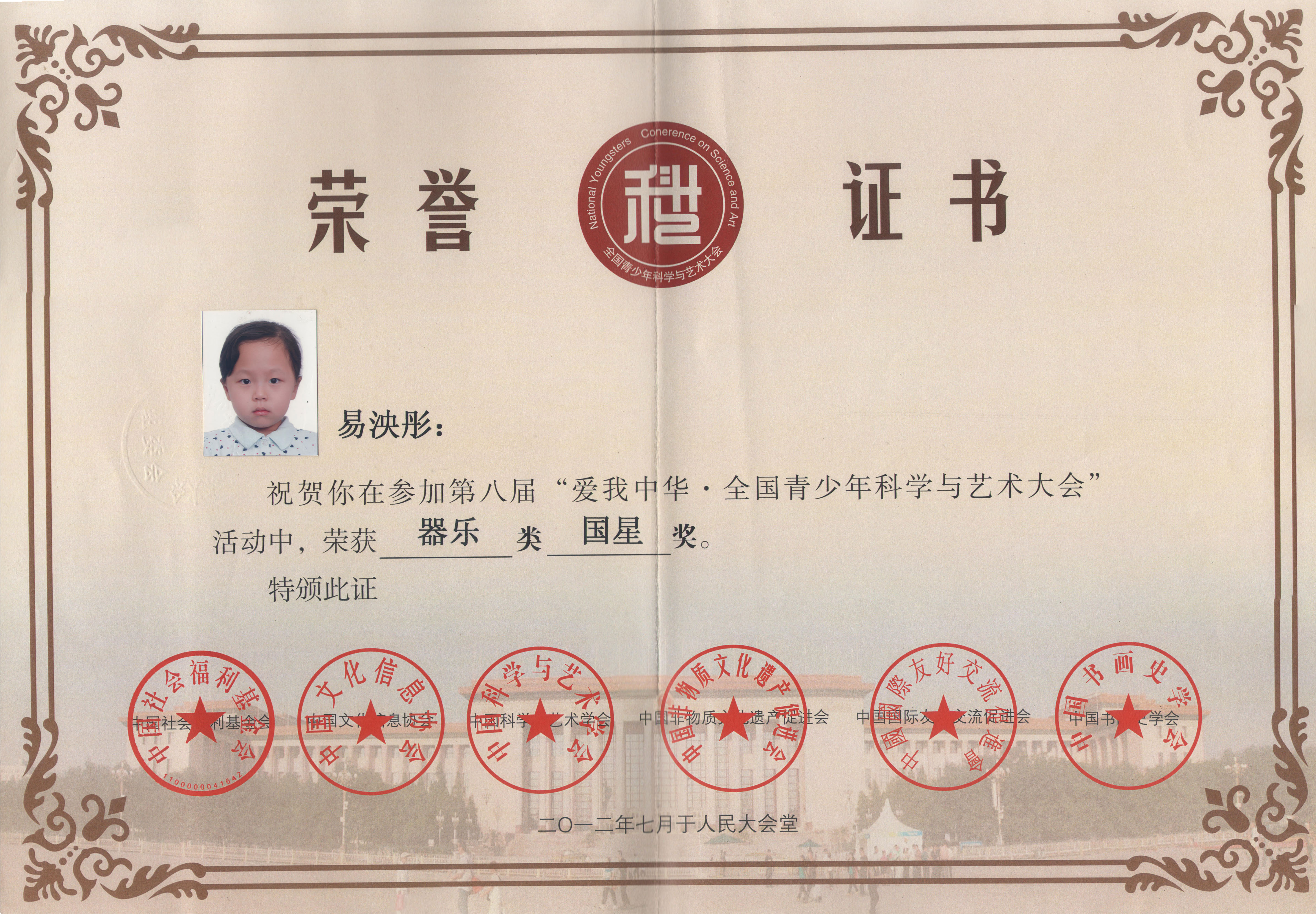 I won the first prize for Piano at the "Love my Country, All China Youth Science and Art Competition" hosted in Beijing on July 2012. This is also the first time I won a prize.
